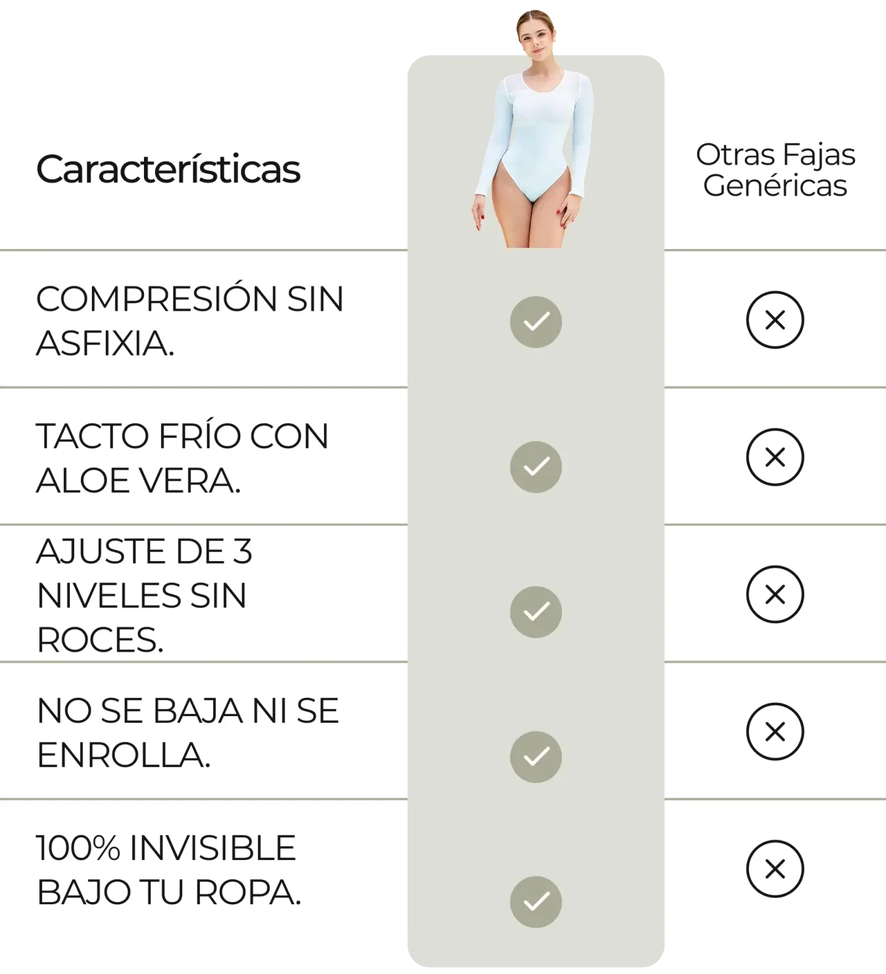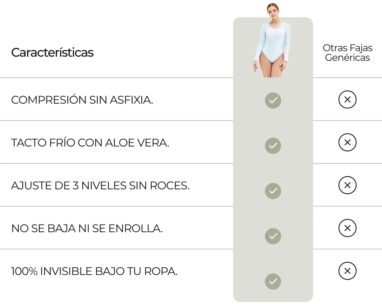 Su sistema de cierre frontal, regulable y de alta resistencia, se adapta a la curvatura individual, otorgando un control preciso sin renunciar a la sensación de confort que debe responder a rutinas de oficina o tareas cotidianas. Adicionalmente, funciona como corrector de postura, favoreciendo una postura estéticamente correcta y saludable. Ideal entonces para el uso diario o como apoyo durante fases postquirúrgicas.